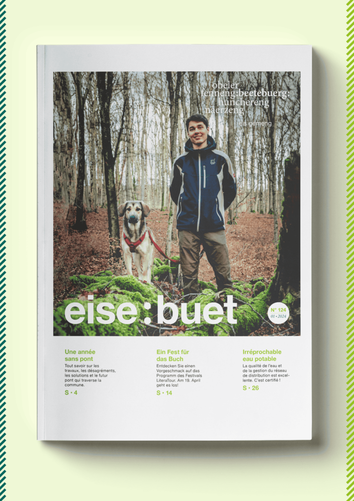 Grâce à des textes dynamiques enrichis de nombreuses citations et une mise en page épurée, ce numéro de printemps présente des dossiers approfondis sur le patrimoine, les loisirs, les services et l’histoire de la commune. Le bulletin propose une interview du nouveau garde forestier ainsi que de l’échevin en charge de la gestion de l’eau qui, chiffres à l’appui, commente la qualité de l’eau potable de la commune. Ne manquez pas non plus la page enfants consacrée aux nouveautés du Parc Merveilleux, les présentations d’événements culturels, un focus spécial sur le 80e anniversaire du bombardement et bien d’autres sujets. Découvrez-le <a href="https://bettembourg.lu/wp-content/uploads/2024/03/BET_BRO_eise_buet_124_01_2024_200x265_SCREEN.pdf">ici</a>.