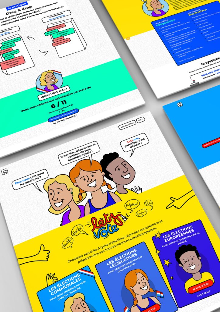 Cette plateforme au look and feel haut en couleur, à l’image de l’univers graphique que nous avons conçu, permet une expérience d’apprentissage fluide et divertissante des élections luxembourgeoises. Pour que l’ASTI puisse mettre en avant letzvote sur ses différents supports (réseaux sociaux, site web, présence salon/foire, etc.), nous avons également conçu un kit de communication comprenant un flyer en cinq langues, un roll-up ainsi qu’un package de visuels pour le web et les réseaux sociaux.