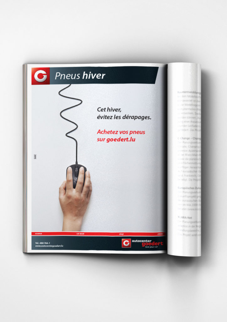 Développement d'un concept visuel et d'une vidéo afin de promouvoir l'achat de pneus en ligne sur le site goedert.lu avec l'accroche « Cet hiver, évitez les dérapages ». Mise en place d'un jeu-concours sur Facebook.