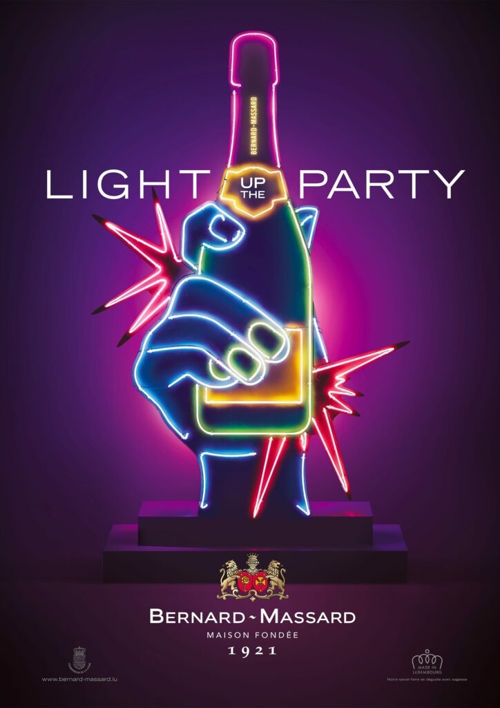 Visuellement, nous sommes partis sur une structure néon so 80, avec une main qui tient une bouteille. Quant au spot, nous nous sommes immergés dans une ambiance de clip musical, avec une chorégraphie hip-hop dynamique. Enfin, nous avons opté pour l’accroche LIGHT UP THE PARTY afin de placer Bernard-Massard comme l’un des acteurs incontournables de la fête.