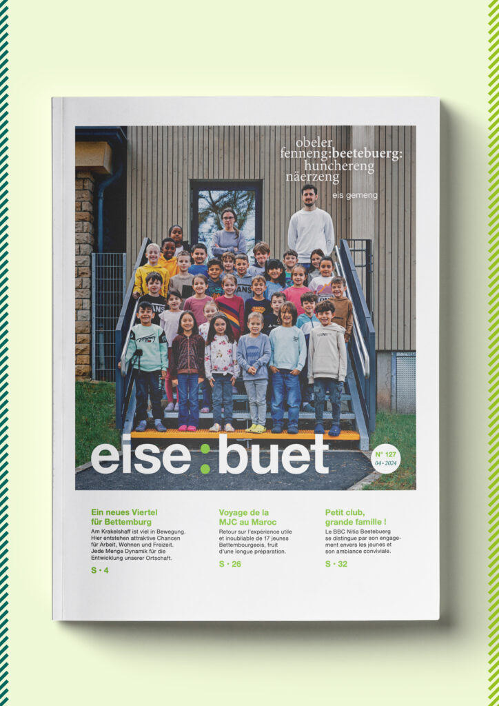 Quatre fois par an, nous collaborons avec la commune de Bettembourg pour publier son bulletin communal, le eise buet. Selon un récent sondage, il ressort comme le canal de communication le plus efficace de la ville, atteignant 70 % des résidents. Pour ce numéro de fin d’année, l’idée était de partir à la rencontre de différents clubs et responsables qui font bouger la municipalité.