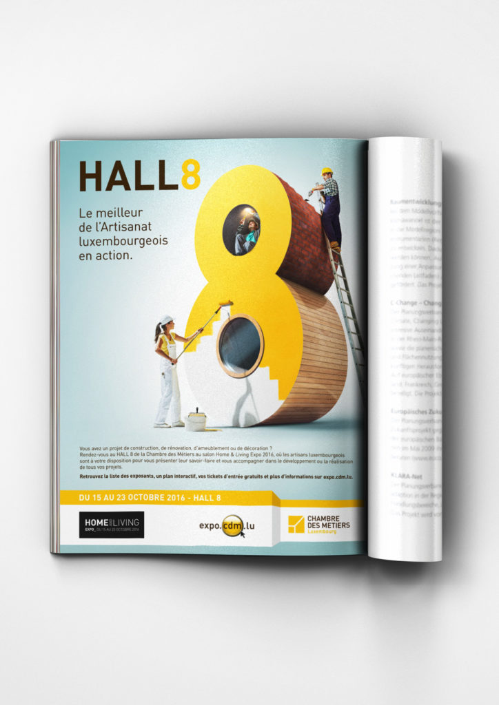 Développement d'une campagne intégrée à destination du grand public pour les inviter à se rendre dans le Hall 8, réservé pour la Chambre des Métiers : annonce, spot vidéo, spot radio, média-planning, création du stand, animation sur place...
