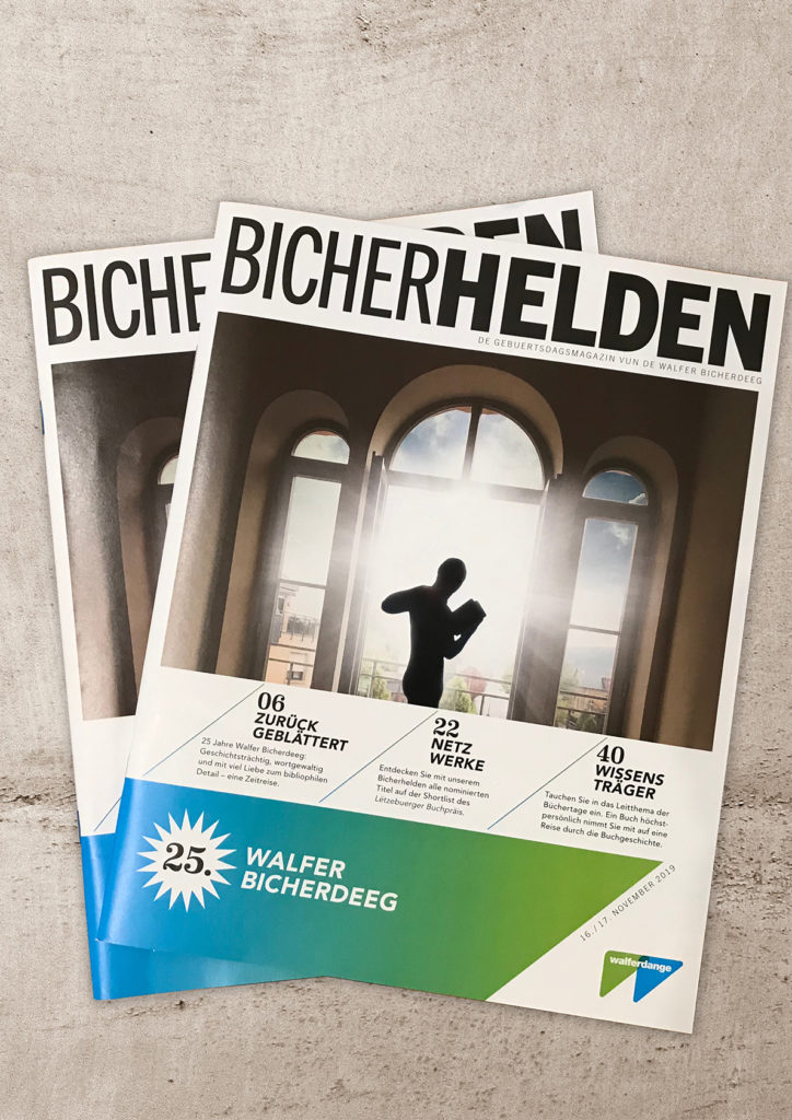 L’agence binsfeld a conçu pour cet anniversaire 8700 exemplaires du magazine « Bicherhelden ». La revue de 60 pages a été envoyé dans toutes les boites aux lettres de Walferdange et était également disponible sur place lors du salon.