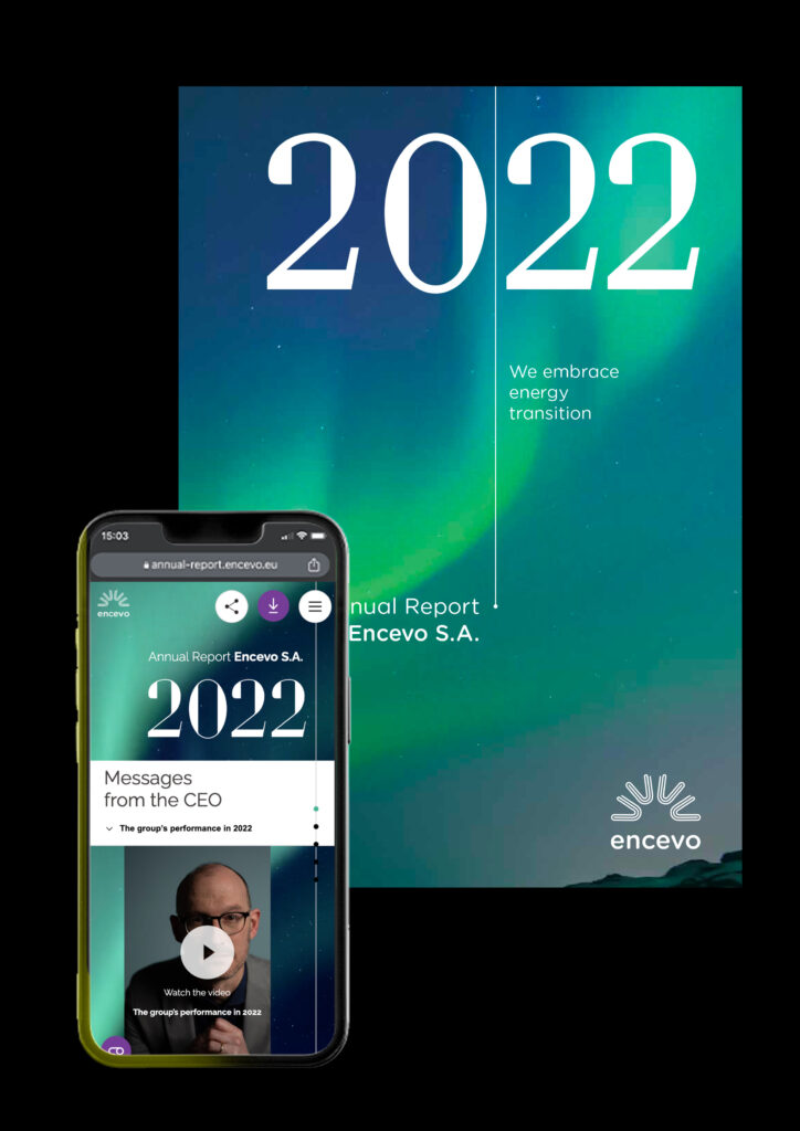 Le rapport annuel, en anglais, se décline en une version <a href="https://annual-report.encevo.eu/wp-content/uploads/2023/05/RA_2022.pdf"target="_blank">papier</a> de 194 pages et en une version <a href="https://annual-report.encevo.eu"_blank">Web</a> plus condensée qui, pour illustrer humainement les valeurs d’Encevo, intègre également des interviews vidéo du CEO, réalisées dans notre studio. En combinant un design attrayant avec un message fort, binsfeld a réussi à créer un rapport annuel cohérent et inspirant.