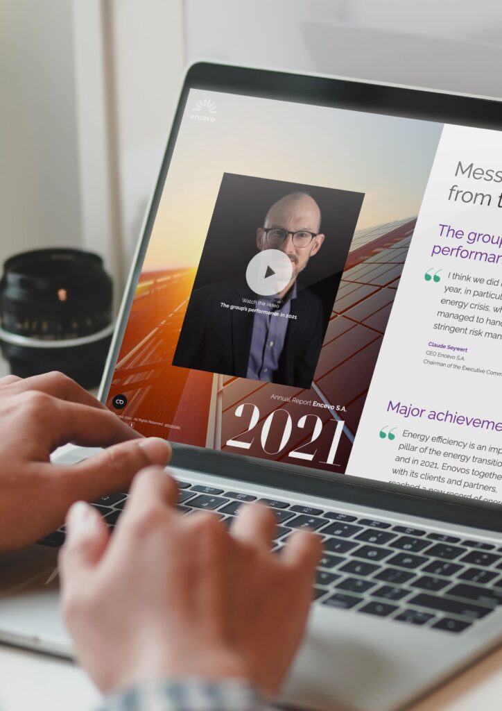 Ce rapport annuel, porté par une conception graphique lisible, fait la part belle à la transition énergétique. De plus, nous avons enrichi le contenu digital avec des interviews vidéo afin de mettre en avant les qualités humaines et la préservation de l’environnement chères au groupe. Rendez-vous sur <a href="https://annual-report.encevo.eu/" target="_blank">annual-report.encevo.eu</a> pour consulter le rapport.