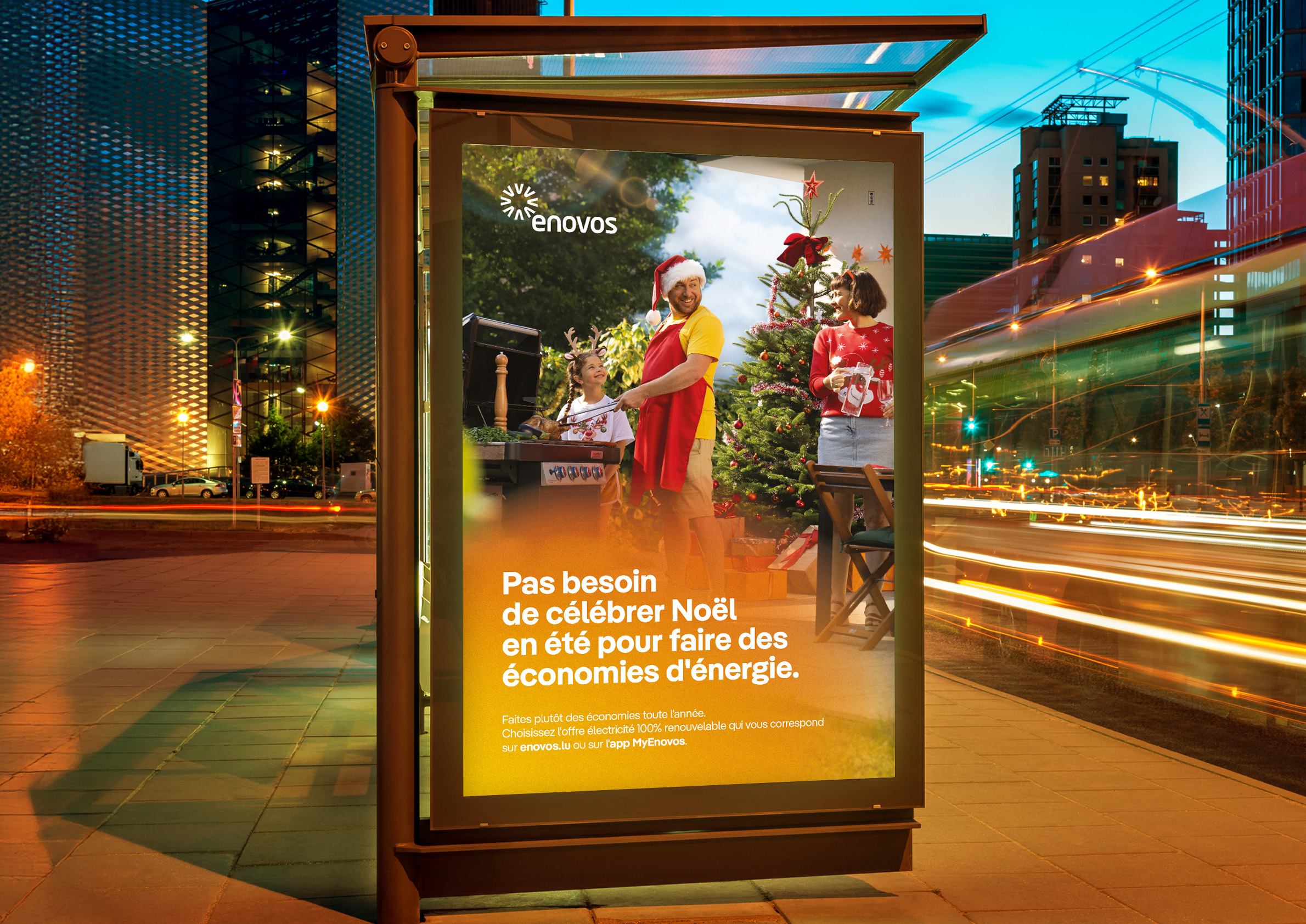 Pour aborder le sujet des économies d’énergie de façon originale et mémorable, nos équipes créatives ont imaginé un concept inattendu : fêter Noël en plein été. Ce parti pris surprenant, à la fois décalé et accessible, permet de faire passer un message fort avec légèreté. Le décalage entre la saison et les codes traditionnels de Noël attire l’attention tout en posant une réflexion concrète sur les habitudes de consommation. L’idée centrale : rappeler qu’il n’est pas nécessaire d’attendre une période exceptionnelle pour adopter les bons réflexes. La campagne invite ainsi les clients d’Enovos à adapter leur contrat d’électricité afin de réaliser des économies tout au long de l’année.