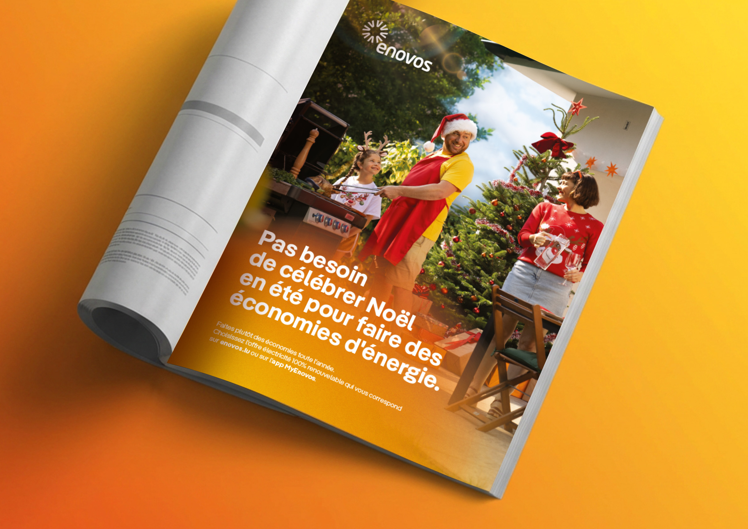 Pour aborder le sujet des économies d’énergie de façon originale et mémorable, nos équipes créatives ont imaginé un concept inattendu : fêter Noël en plein été. Ce parti pris surprenant, à la fois décalé et accessible, permet de faire passer un message fort avec légèreté. Le décalage entre la saison et les codes traditionnels de Noël attire l’attention tout en posant une réflexion concrète sur les habitudes de consommation. L’idée centrale : rappeler qu’il n’est pas nécessaire d’attendre une période exceptionnelle pour adopter les bons réflexes. La campagne invite ainsi les clients d’Enovos à adapter leur contrat d’électricité afin de réaliser des économies tout au long de l’année.