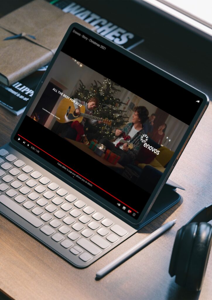 Nous avons réalisé, 100 % en interne, un spot de fin d’année pour Enovos dans lequel deux frères partagent leur passion du rock. La vidéo a été diffusée au cinéma, sur RTL et sur les réseaux sociaux. Nous avons également créé des déclinaisons print pour la presse et l’affichage OOH.