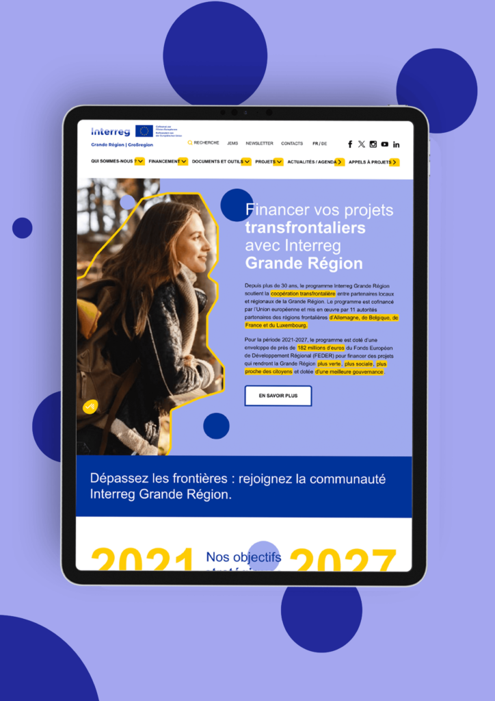 Notre département digital a injecté une dose de créativité avec des alternatives graphiques audacieuses, humaines et vibrantes qui renouvellent l’image d’Interreg. Grâce à une plateforme WordPress sur mesure et intuitive, notre équipe de développeurs a simplifié la gestion et la mise à jour du contenu.