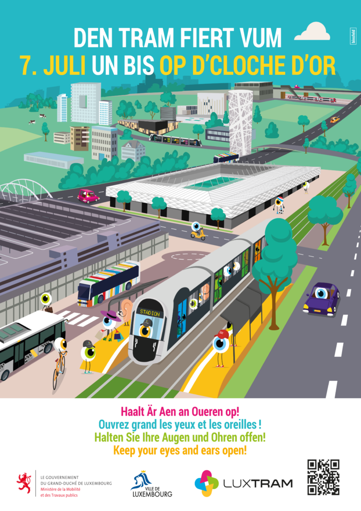 Nous avons produit une invitation pour l’inauguration, une vidéo d’information et de sécurité destinée aux écrans du tram ainsi qu’un key visual décliné en de nombreux supports digitaux et print, dont une version comics pour le 30e Festival international de la BD à Contern.