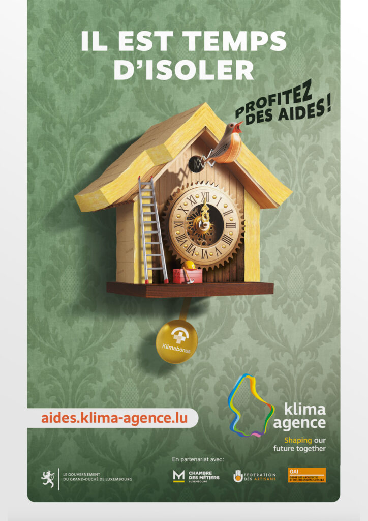 Notre team a produit une campagne de promotion pour la rénovation énergétique des bâtiments d’habitation qui s’exprime sur de multiples supports : presse, abribus, top-back bus, spot radio, réseaux sociaux et un stand à Home Expo, le Salon de l'habitat au Luxembourg. Les messages « Il est temps d’isoler » et « Profitez des aides » en français, luxembourgeois, allemand et anglais sur le key visual invitent les résidents luxembourgeois à consulter le <a href=" https://aides.klima-agence.lu/" target="_blank">simulateur de projet</a> de rénovation et d’aides disponibles.