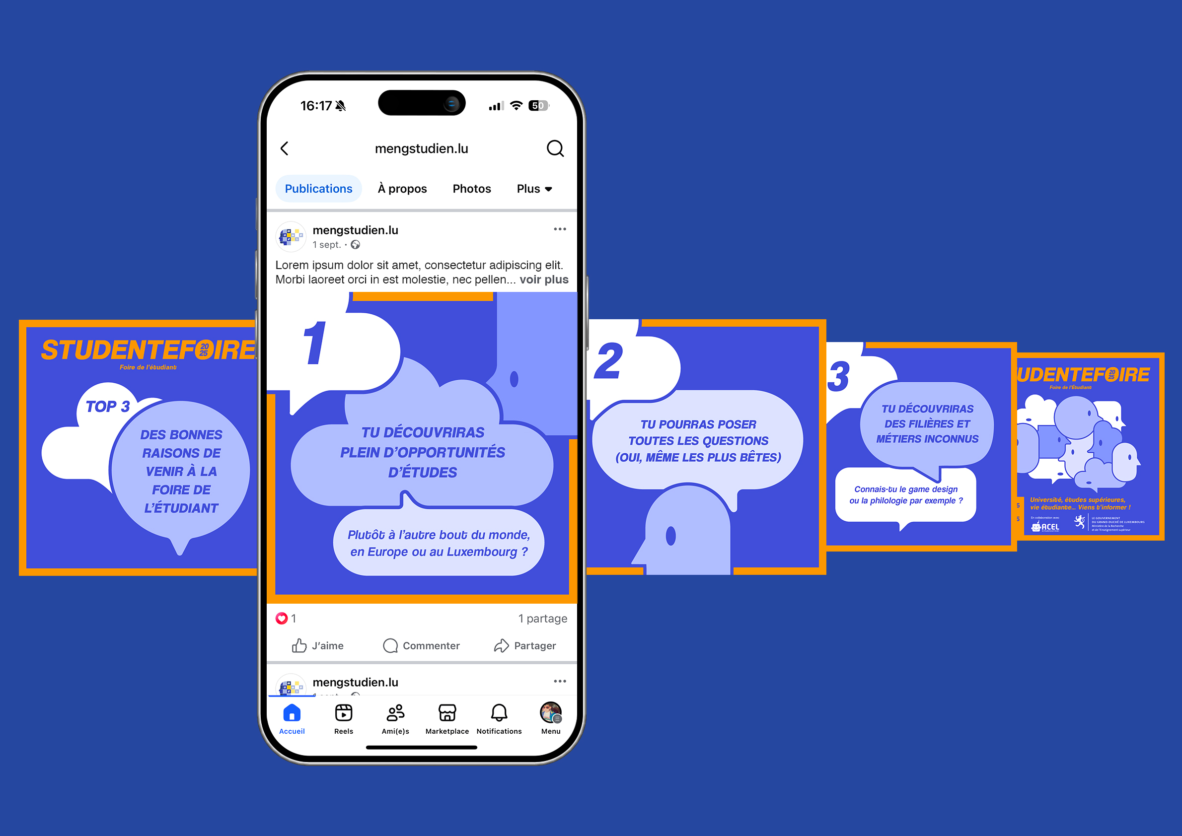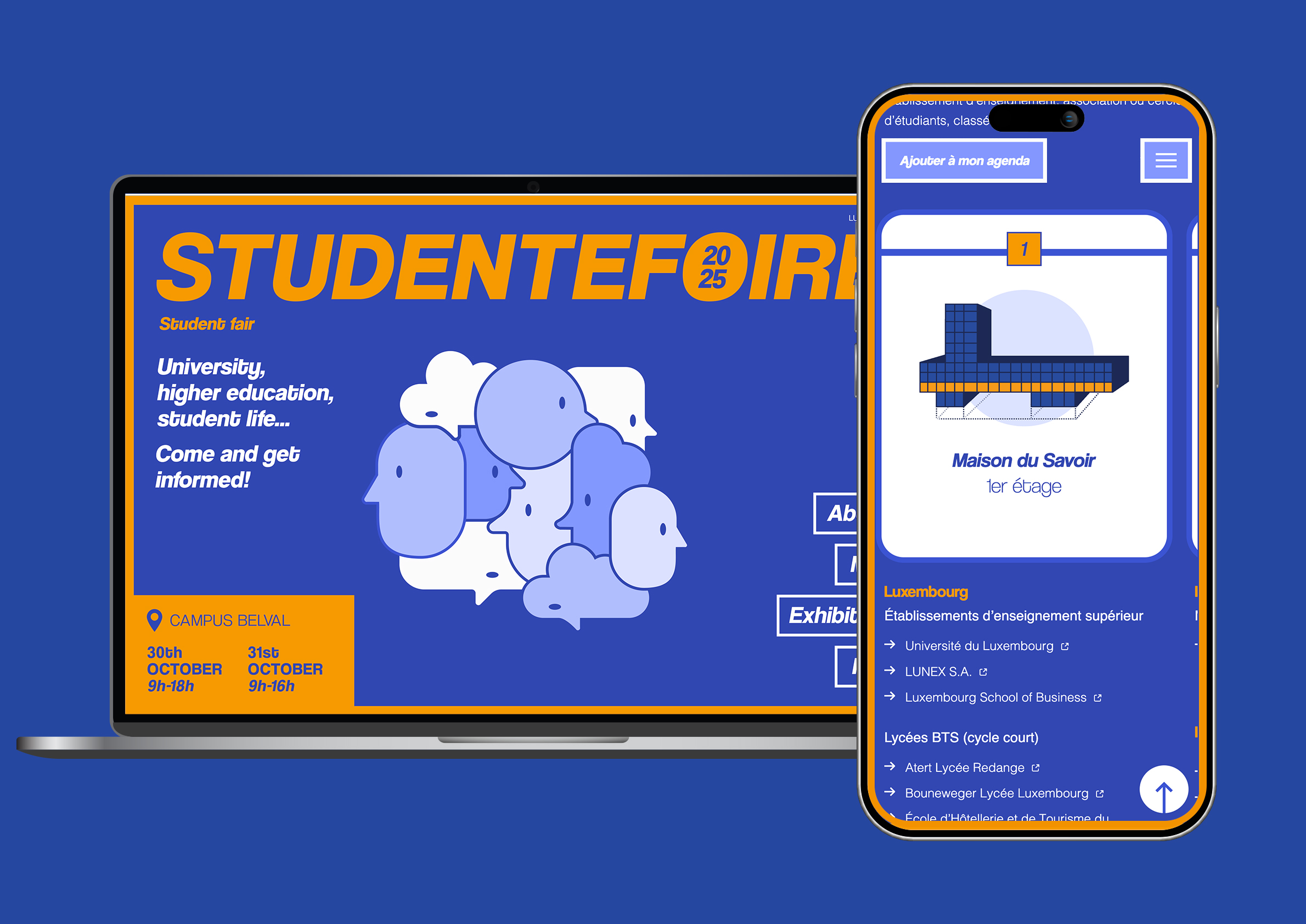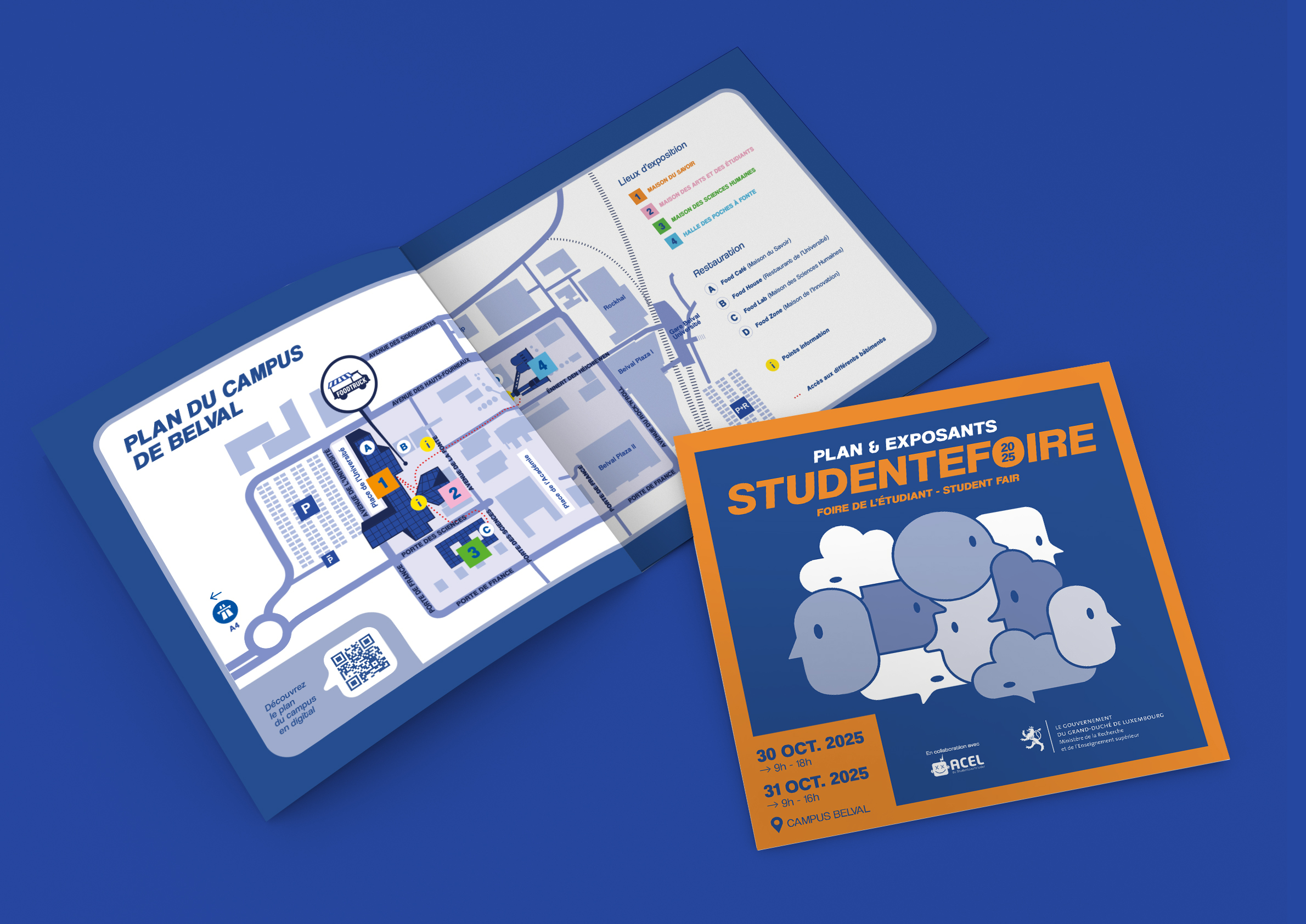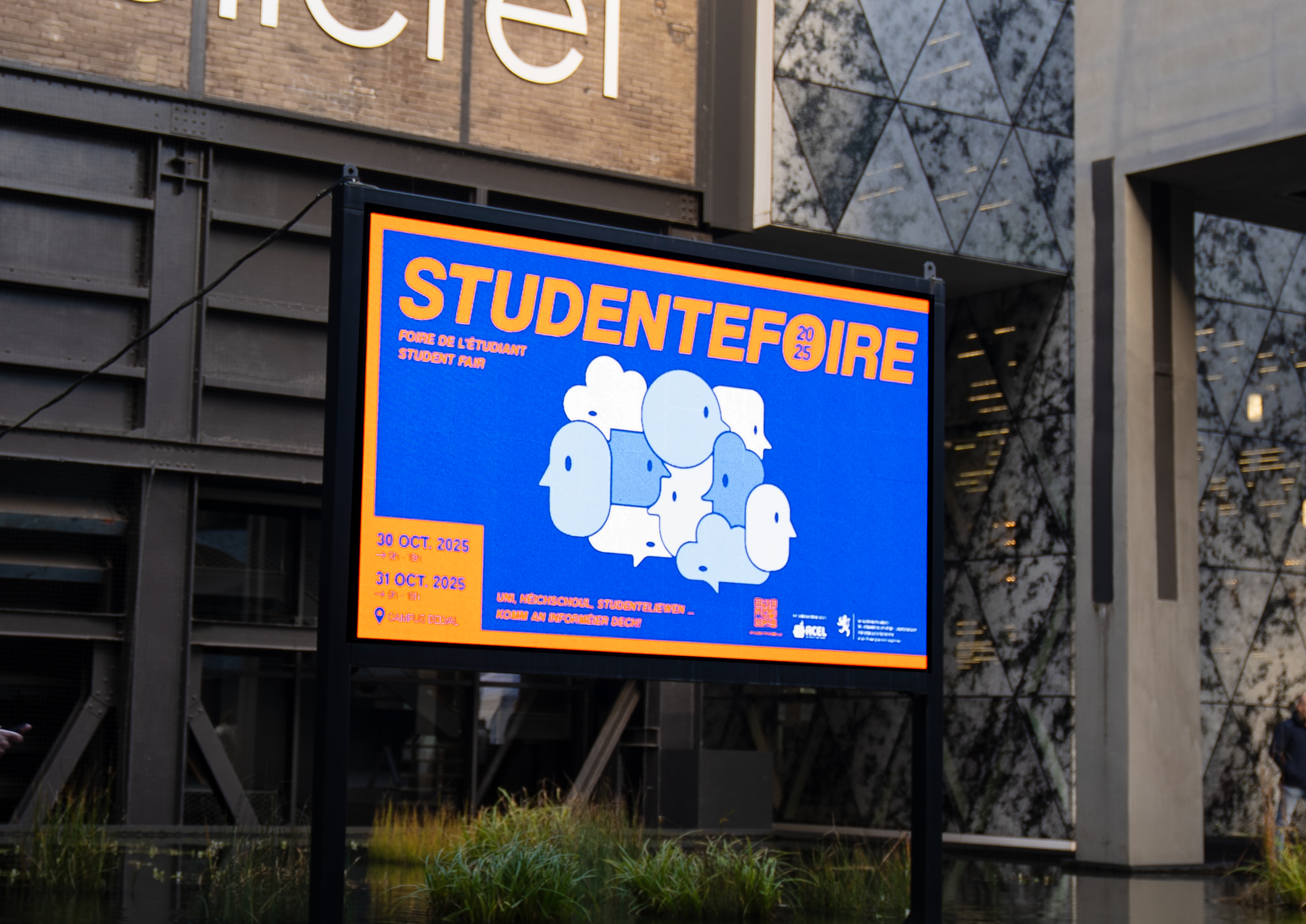 Nos équipes ont imaginé une campagne graphique minimaliste et pop, ancrée dans les codes actuels des jeunes générations. Le concept visuel a été décliné sur tous les supports de communication liés à l’événement : affichage, signalétique, beach flags ou encore dépliant distribué lors de l’événement comprenant le plan du campus et la liste des exposants. Sur le volet digital, nous avons conçu une campagne trilingue (français, luxembourgeois, anglais), pensée pour toucher efficacement chaque cible (étudiants, parents et professeurs). Trois formats ont été développés : un visuel avec les informations clés, un motion design dynamique et un carrousel social media : « Le top 3 des bonnes raisons de venir à la Foire », accompagné d’une version déclinée pour les parents. Enfin, nous avons mis en place une <a href="https://studentefoire.lu/" target="_blank">landing page</a> multilingue centralisant toutes les informations pratiques (plan, liste des exposants, FAQ), accessible via un code QR intégré sur les supports print les plus adaptés.