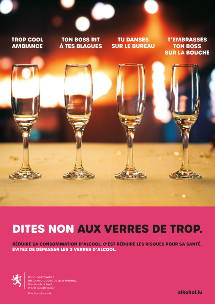 La campagne s’étend sur des mailings aux entreprises, trois courtes vidéos pour chaque cible, en français ou en luxembourgeois, destinées aux réseaux sociaux et un quatrième spot en motion design qui énumère sept tips pour réduire sa consommation d’alcool, comme alterner avec des softs ou s’assurer d’avoir mangé une petite collation avant une soirée « à risque ».
