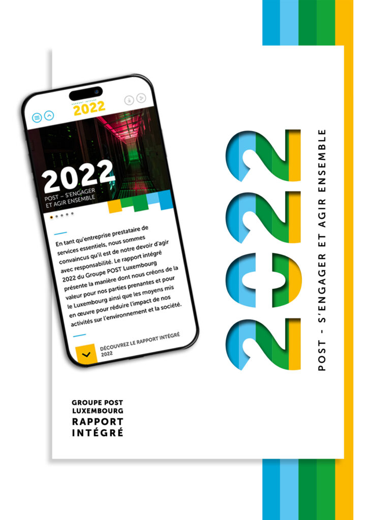 Nous avons réalisé un rapport intégré en deux versions, <a href="https://cdn.post.lu/rapport-integre-2022/docs/POST_Rapport_Integre_2022_WEB.pdf"target="_blank">print</a> et <a href=" https://www.postgroup.lu/resultats/rapport-integre"target="_blank">Web</a>, qui documente l’analyse et les engagements RSE de Post. Nous avons mis l’accent sur les infographies pour améliorer la lecture des données du Groupe au cours de l’année 2022. Le rapport imprimé compte 122 pages en quadrichromie. Le site, en trois langues (anglais, allemand et français), offre une vision complète du rapport.