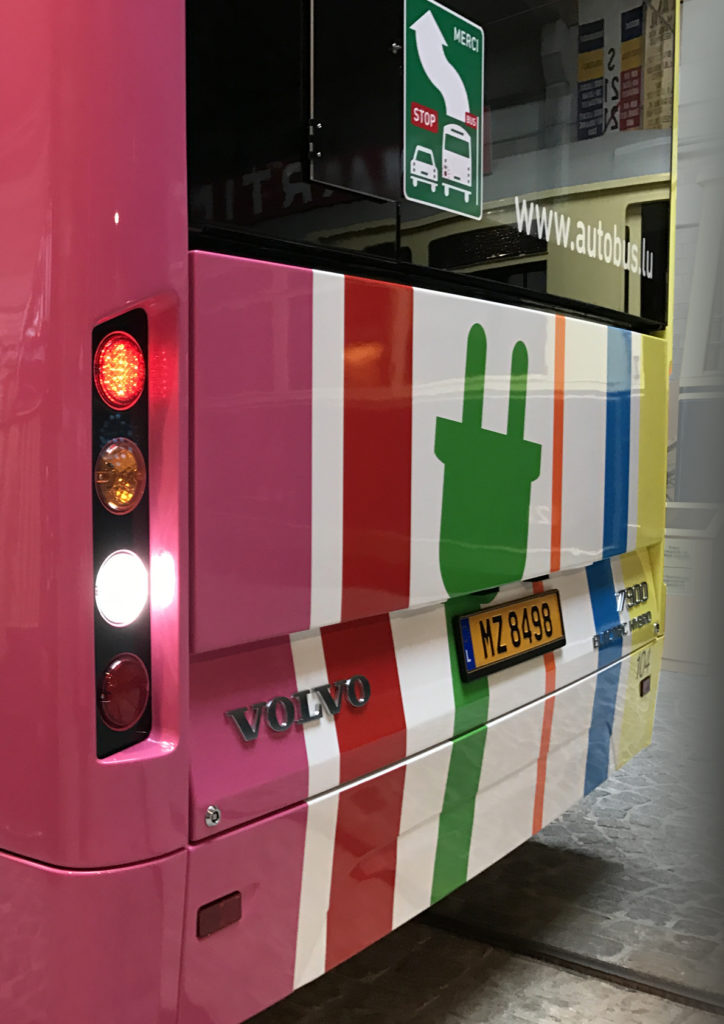 Design des 5 nouveaux e-bus électriques hybrides de la Ville de Luxembourg, tout en respectant le design « multiplicity » existant, habillage de l’intérieur des e-bus et de la station de recharge de la gare.
