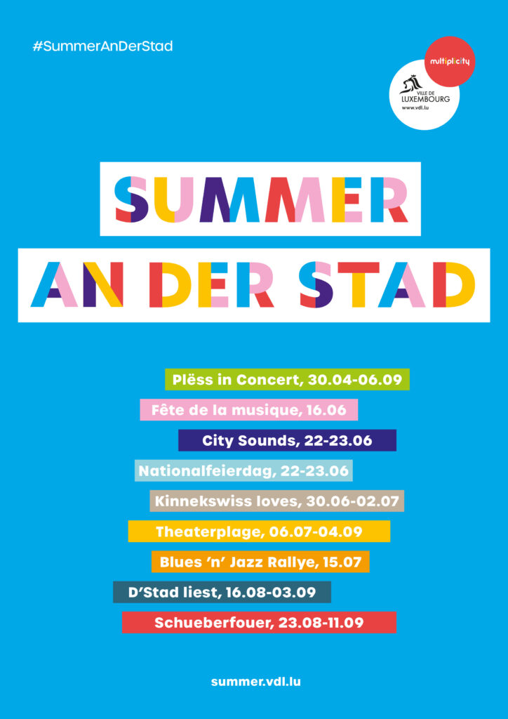 Nous avons fourni un template PowerPoint pour la conférence de presse « Summer an der Stad ». Nous avons ensuite désigné et suivi la production des affiches. Puis, pour chacun des événements, nous avons réalisé les calicots, les visuels print pour le magazine City, les animations vidéo destinées aux écrans sur la scène, les programmes papier, les visuels abribus et la communication digitale pour les réseaux sociaux et les sites Web.