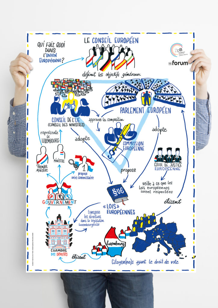 Concevoir une affiche A1 illustrée et pédagogique qui présente, au recto, les relations entre les institutions européennes, le Parlement et le gouvernement luxembourgeois et les électeurs et, au verso, des explications sur les rôles des acteurs.